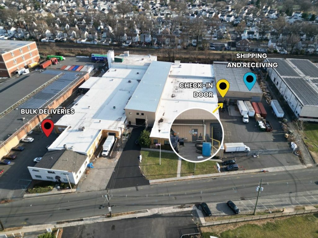 The yellow pin shows the check-in door, where every driver should go upon arriving at RMA’s address. The blue pin shows where the shipping and receiving dock is located. The red pin shows where bulk deliveries should be made.